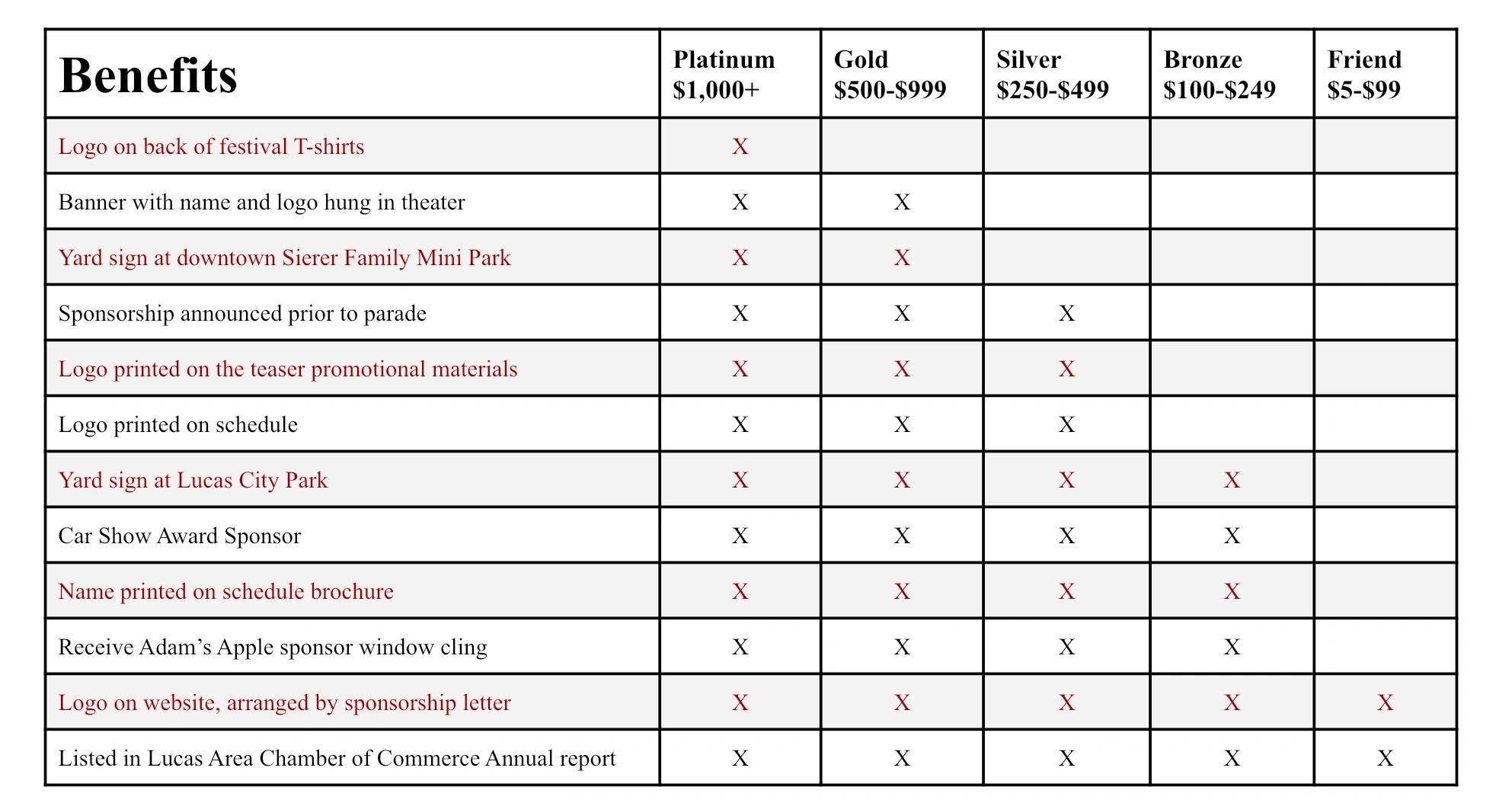 The purpose of the Adam’s Apple Festival is to celebrate our town's past, present, and future by hosting meaningful, engaging, and fun events for all ages. Some of the things we need most include monetary contributions and volunteers to host and assist events. If your organization contributes to Adam’s Apple Festival, we'd like to offer promotional opportunities. To the right, you’ll see a tiered list of promotional benefits.